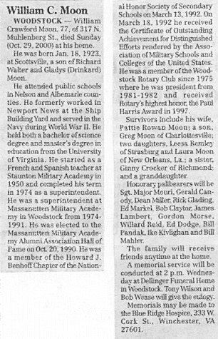 Col. Moon passed away early Sunday morning, October 29, 2000. His son, Greg, said that they spent an enjoyable Saturday afternoon together watching the UVA vs. UNC game, and Col. Moon then felt poorly later on, passing away quietly in his sleep. It was the end of an extended illness that had afflicted him since at least the previous January.A memorial service took place on Wednesday, November 1, at Dellinger Funeral Chapel, 159 N. Main Street, in Woodstock. Col. Moon's son, Greg, can be e-mailed at: pmoon@shentel.net