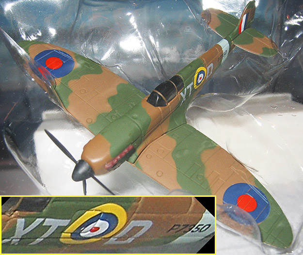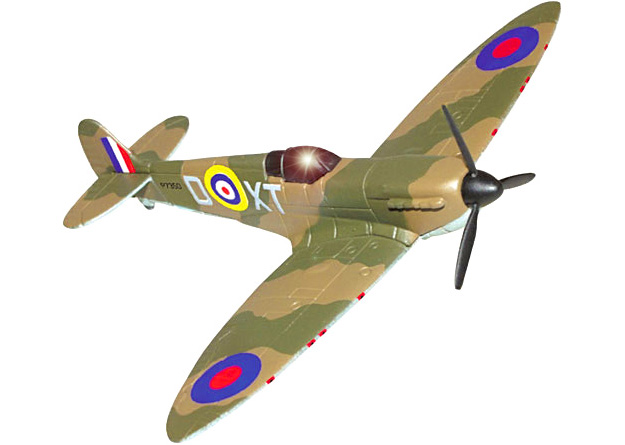 The Royal Air Force BBMF Spitfire image (above) is the actual, 1:110.5-scale model being offered. There are very limited numbers of the model available. The Spitfire replica is a high quality, die-cast model, not plastic, with actual historical markings of the Royal Air Force's BBMF (Battle of Britain Memorial Flight) painted on with great detail, not pressed or decals, which are the actual markings of the aircraft that took the fight to the Nazis in WWII, and each aircraft features a unique display stand and has a free-spinning prop. The wingspan is 4 inches, making it a respectable display piece, or a great gift for appropriately-aged kids. Retailers, such as the Smithsonian Store, sell replicas of this size and type for $16, plus $8 shipping, so dor this Spitfire, the $15 cost, plus $5.25 shipping, is very competitive.