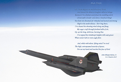 This beautiful fighter-escort’s-view image of mankind’s passage through the ocean of air makes a great wall-art hanging or gift for any pilot, aerospace professional, or enthusiast. Seen here at monitor resolution of only 72dpi, this is an actual photograph of the aircraft in flight, not super-imposed or special effects. The skyscape images are custom printed on highest quality 13x19-in. paper, which, if combined with a 5-inch mat and, say, a 3-inch frame, gives you a really nice, approximately 35-inch wide wall-hanging piece. And each skyscape will have the color saturation and resolution necessary to render the beauty of the scene, and each will provide years and years of viewing enjoyment when properly displayed as any photograph should be. Note that the image without the High Flight-text overlay is cropped less so that the Blackbird is more centered, compared to with the overlay (below), and the copyright mark does not appear on Blackbird prints.Plus, with any order, you’ll also receive, by e-mail attachment, your choice of a 1024- or 1280-wide digital image, with or without the High Flight (HF) text overlay (selection options are below) to use in your screensaver or wallpaper list.