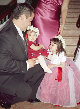 There are circles within circles at any wedding, and this bridesmaid, the daughter of the groom, was a dutiful and loving participant in welcoming her new stepmother into the family.While any wedding coverage centers upon the brides circle, a photographer must always be scanning the key family members and guests to capture the moments that compose their part of the wedding story; so, there is never a pause from recording one image to planning and moving on to the next. The amount of film or use of the equipment really cannot be among the problems in the process, and a thorough knowledge of the cameras operation with its accessories is imperative if the photographer's attention is to be fully upon the events and conclude in successfully achieving the desired results.